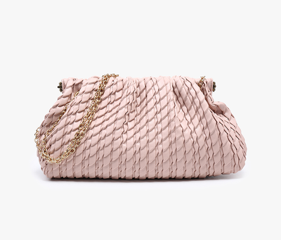 Indulge in luxury with the Ruthie Clutch. This textured vegan leather bag is perfect for your next date night, and the metal chain adds a touch of elegance. Its compact size allows for easy carrying while still fitting all your essentials. Elevate your style and make a statement with this exclusive bag.
