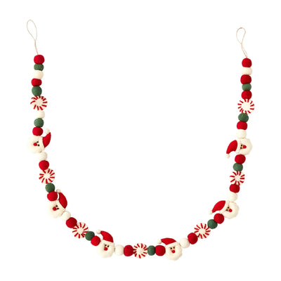 Get ready for Christmas with our Santa or Reindeer Christmas Garland! This festive decoration showcases delightful felted poms and icons, adorning sturdy jute cording. Crafted from 100% Wool shell, 100% Polyester filling, and adorned with 100% Wool decoration. It measures 60 inches in length, adding a touch of holiday charm to any space. Spot clean only to maintain its vibrant appeal throughout the season.