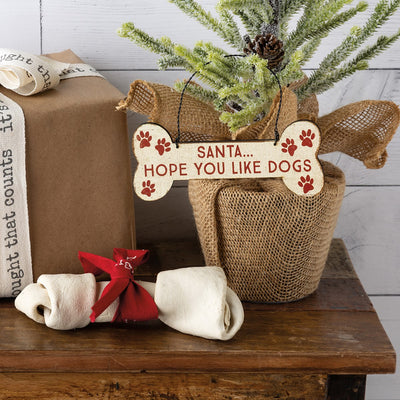 a dog bone shape, paw print designs, and "Santa… Hope You Like Dogs" sentiment. Our Santa Hope You Like Dogs ornament is easy to hang via twisted wire loop.