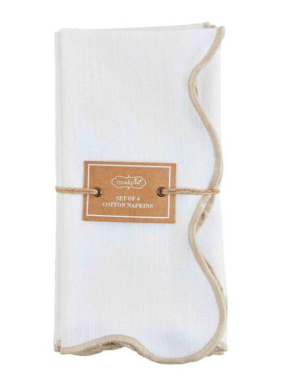 Set of four cotton dinner napkins with satin stitch scallop trim.