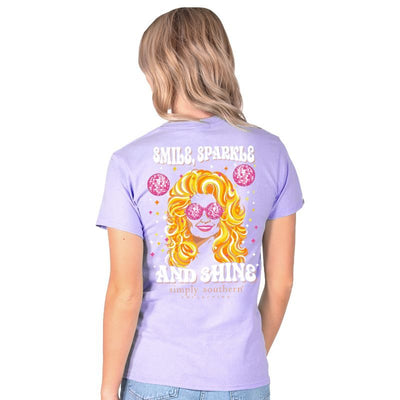 Aster purple short sleeve shirt with the phrase SMILE SPARKLE AND SHINE and the silhouette of a woman with disco lights reflected in her glasses
