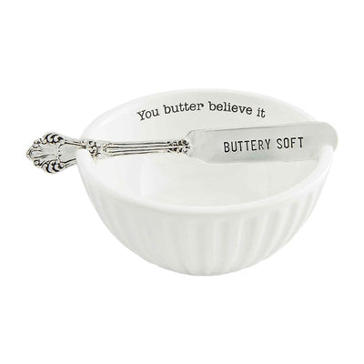 2-piece set. Fluted ceramic soft butter dish. Comes with stamped silverplate spreader.