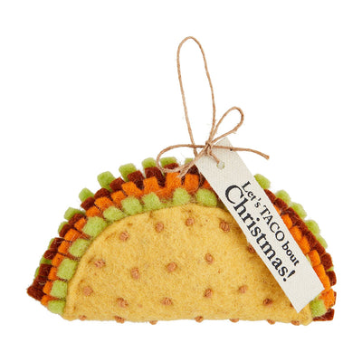 The Taco Ornament is a delightful addition to your holiday decor. Crafted from high-quality felted wool, this stuffed ornament is designed to resemble a mouthwatering taco. Measuring 2 3/4" x 5 1/4", it is the perfect size to hang on your Christmas tree or display on a festive garland. The intricate details, including the textured shell, vibrant toppings, and even a sprinkle of cheese, make this ornament truly stand out. Whether you're a taco lover or simply appreciate unique and whimsical decorations, the Taco Ornament is sure to bring a smile to your face. It also makes a fantastic gift for friends and family who share your love for tacos or enjoy quirky ornaments. Add a touch of fun and flavor to your holiday celebrations with the Taco Ornament.