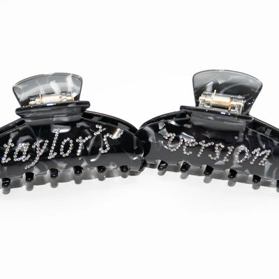 This hair claw is made of durable cellulose acetate, which is environmentally friendly and biodegradable. Its interlocking teeth keep hair securely in place. One side says "Taylor's" and the other says "Version" and the rhinestones are embedded within the clip.