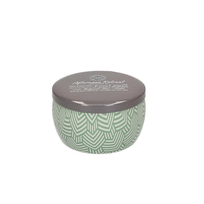 Catchy green and white markings span across this Afternoon Retreat candle's compact tin design, making it the perfect candle to give as a gift! Best described as the scent of soft moss with teak, sandalwood, amber, fresh bergamot and lime, your Afternoon Retreat Candle is made with soy-blend wax, and lead-free cotton wick, and a lot of love! This candle provides 3 meals for a child in need through our partnership with Rice Bowls, which is made possible by your purchase! Burn Time is up to 30 hours Content/Weight is 4 oz/114 grams.