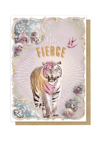 PAPAYA’s classic, purple Fierce Greeting Card is a fan favorite illustrated with original artwork of a powerful tiger, delicate sun rays, purple florals and a fluttering sparrow; it is sure to brighten your day. Perfect for all occasions such as wedding, anniversary, business, bridal, baby, birthday, mother’s day and graduation.