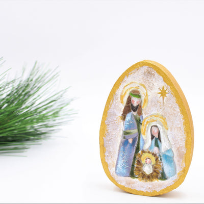Welcome the holy family into your home with this beautiful 5" Handpainted Oval Holy Family Tabletop. A stunning representation of the holy trinity, it is sure to warm hearts and bring joy to your loved ones. Enjoy its exquisite craftsmanship and timeless beauty!
