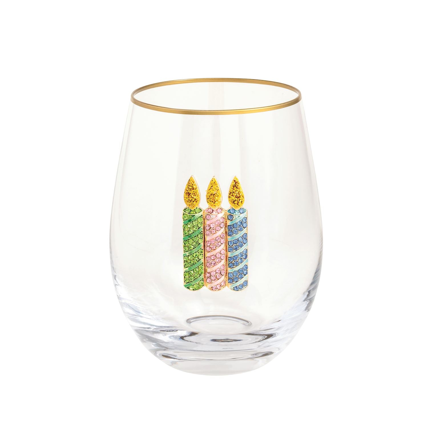 Celebrate in style with this elegant stemless wine glass, featuring a hand-painted rim and textured beaded exterior. Choose from three festive birthday designs that add a personal touch to your special occasion. Perfect for toasting milestones or gifting to the birthday person in your life. The stemless design offers modern stability and comfort in hand, making it ideal for everyday enjoyment or memorable celebrations.