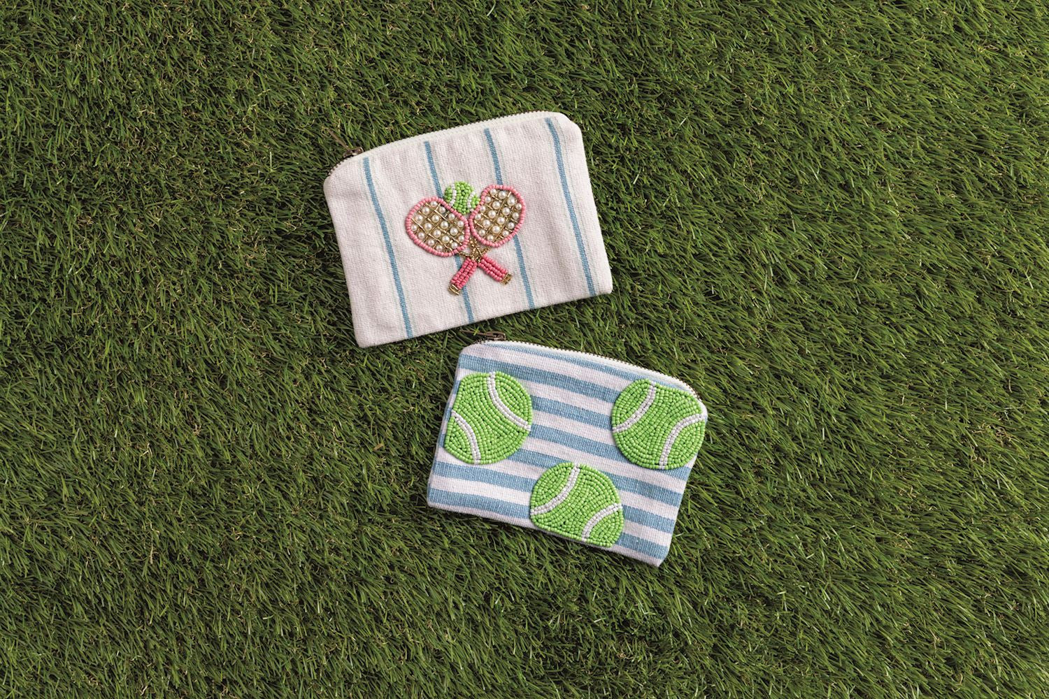Stripe cotton zipper pouch features beaded icon appliqué