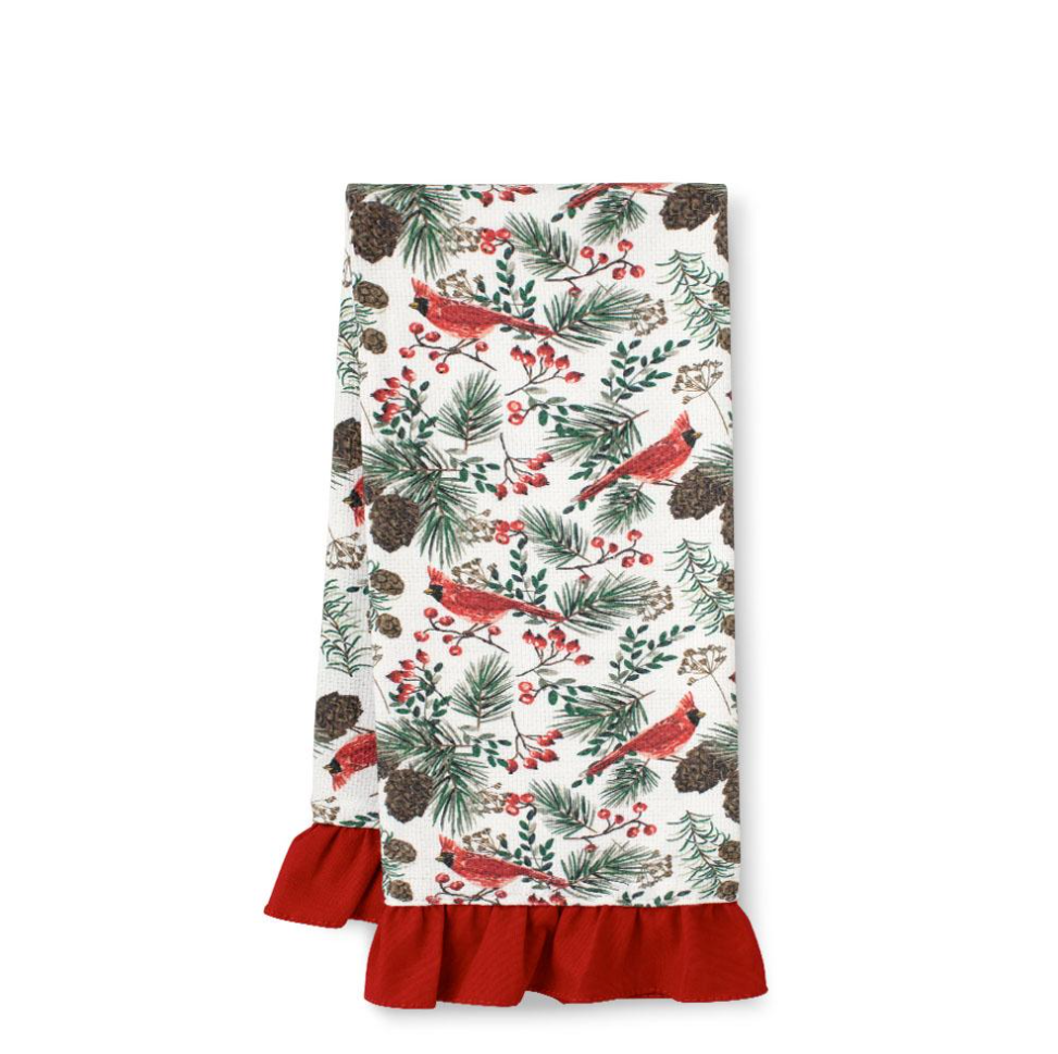 Ā Traditional red cardinals perch on winter pine branches on a glitter snow white background. š¦