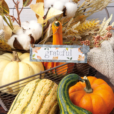 A metal ornament featuring a hand lettered "Grateful" sentiment with a metallic fall-inspired palette and coordinating leaf design. Our Grateful ornament easily hangs via twisted top wire loop.