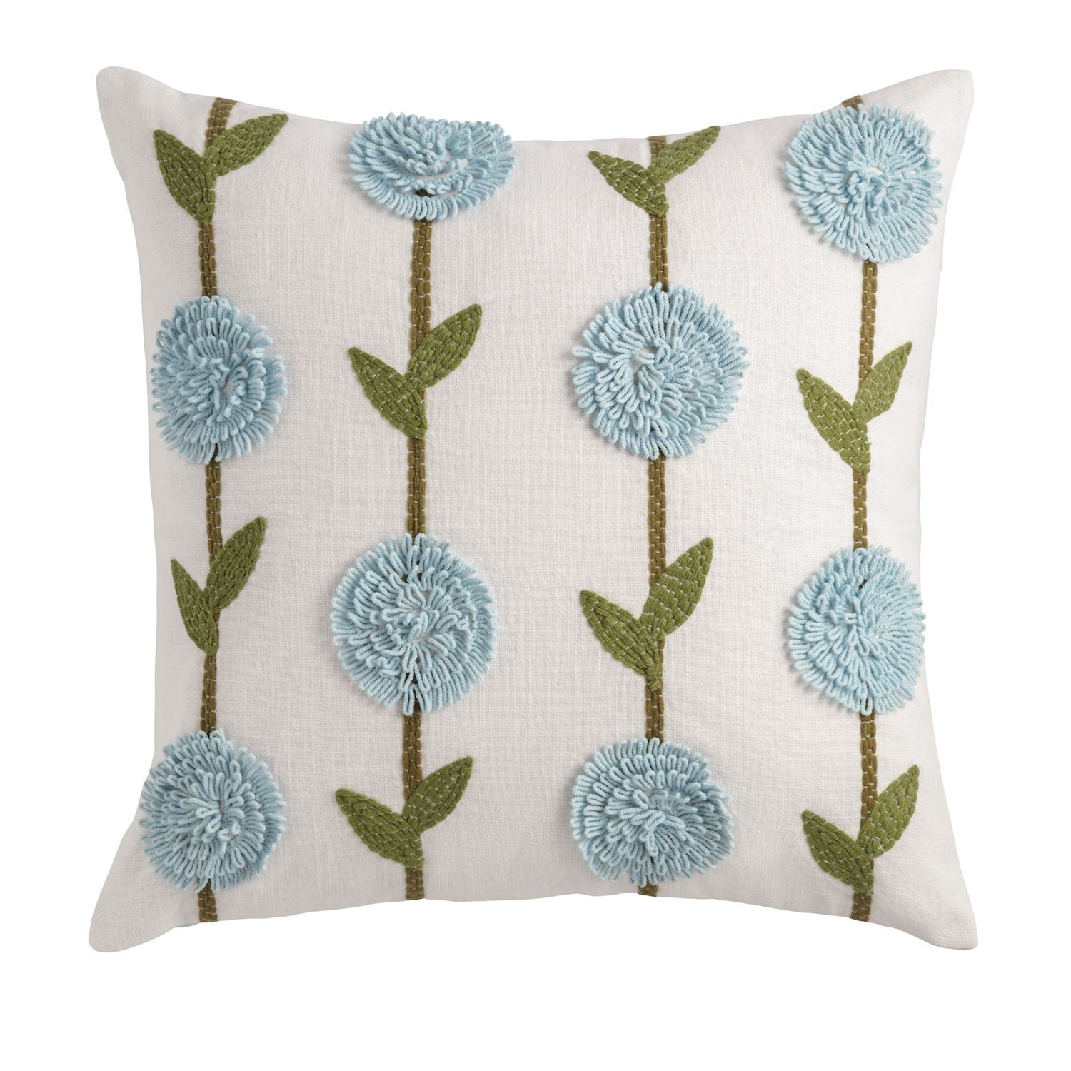 Embroidered cotton pillow with colored canvas backing. Zipper closure