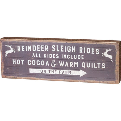 A slat wood box sign lending a distressed "Reindeer Sleigh Rides - All Rides Include Hot Cocoa & Warm Quilts On The Farm" sentiment with reindeer and arrow designs in a neutral palette. Complements well with coordinating design pieces or existing decor. Easy to hang or can free-stand alone.