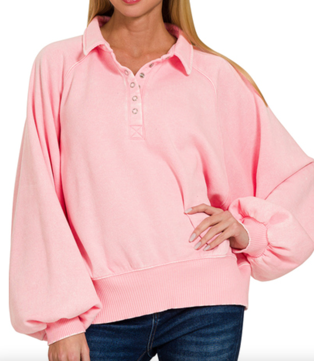 ACID WASH FLEECE BUTTON UP COLLARED PULLOVER